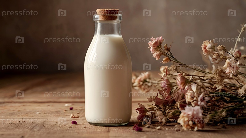 Органическое натуральное овсяное молоко в стеклянной бутылке на стильной деревянной доске и растения.Натуральные, экологически чистые продукты