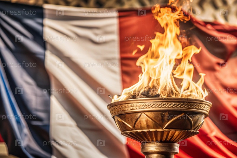 Пламя олимпийского факела горит на размытом фоне французского флага