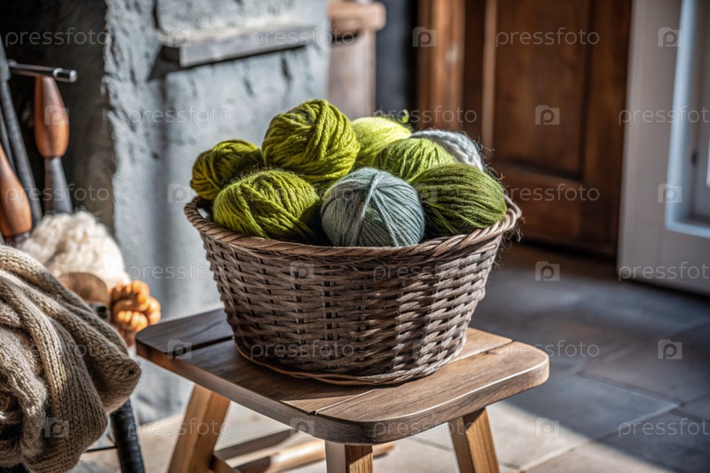 Шары из пряжи в плетеной корзине на деревянном стуле. Игла, текстиль, вязание. Зимний сезон, малый бизнес, ручная одежда