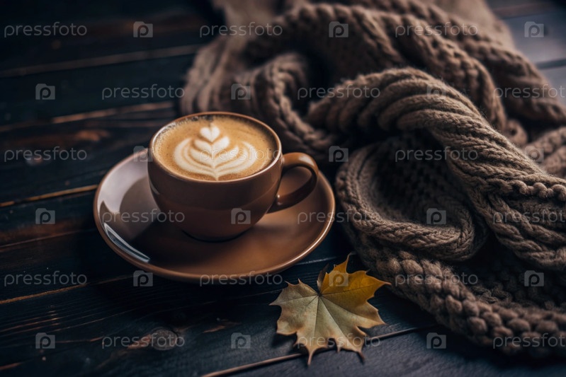 Сладкое горячее капучино в кружке с тарелкой и вязанной канавкой, шарф на деревянном столе внутри кафе. дождливый осенний день