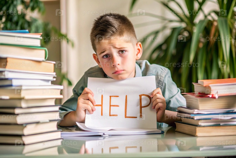 Учебный год.Ребенок сидит за столом с кучей учебников, книг и знака помощи.Образование, помощь