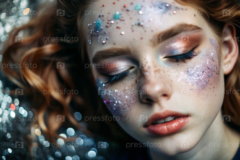 Покрытие лица девушки праздничным макияжем и ленточками.Изображение придает ей сказочный и мистический вид.Концепция новогодней ночи или дня рождения