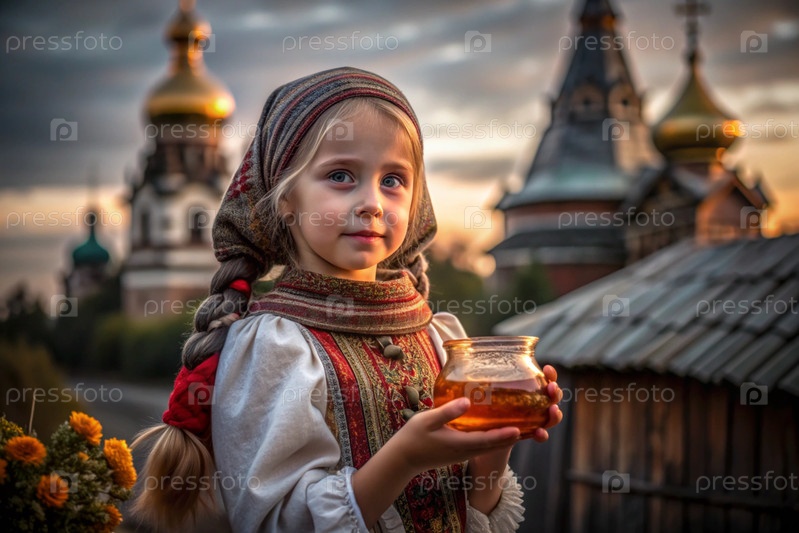 Концепция российского православного праздника 'Мед Спаситель' - красивая маленькая девочка в русской национальной одежде и шарф с баночкой меда на фоне православной церкви