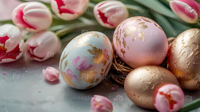 Нежные пасхальные яйца в розовых, золотых и фиолетовых тонах и цветы тюльпанов на пастельном акварельном фоне с деликатными венами