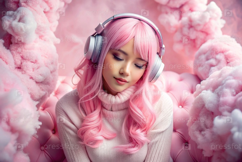 Молодая красивая японская девушка с розовыми волосами в аниме слушает музыку на беспроводных наушниках в розовых облаках