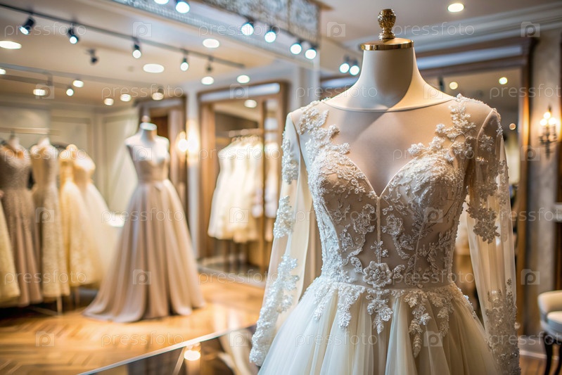 Аренда и покупка свадебных платьев для мероприятий. Близкие. Элегантное белое свадебное платье на манеке в роскошном брачном салоне