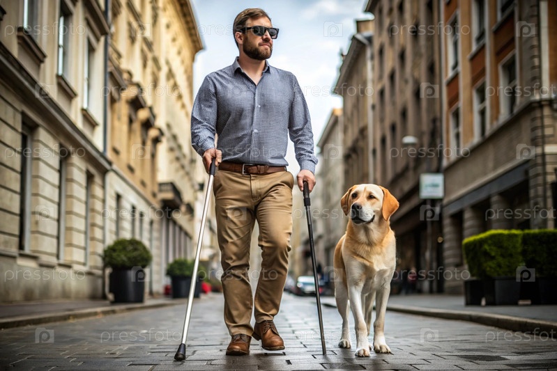 Инвалидность. Потеря зрения. Слепой в темных очках с тростью и собакой-поводырем на поводке на городской улице. Международный день слепых 13 ноября