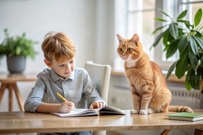 Образование и обучение. Маленький мальчик делает домашнее задание. Ученик выполняет школьное дома. Рядом со мной сидит рыжеволосая кошка