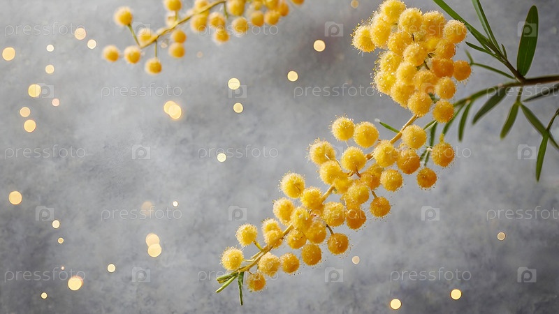 Красивый пушистый букет мимозы на сером фоне. Близкий. Идея весны и Международный женский день 8 марта