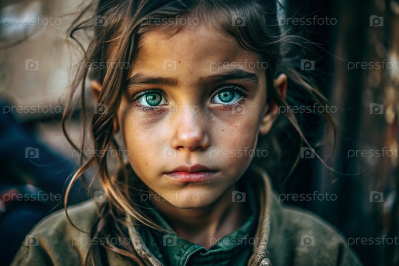 Голод, бедность.Портрет красивой грязной попрошайки с ярко выраженными зелеными глазами.Голодный бедный ребенок смотрит в камеру