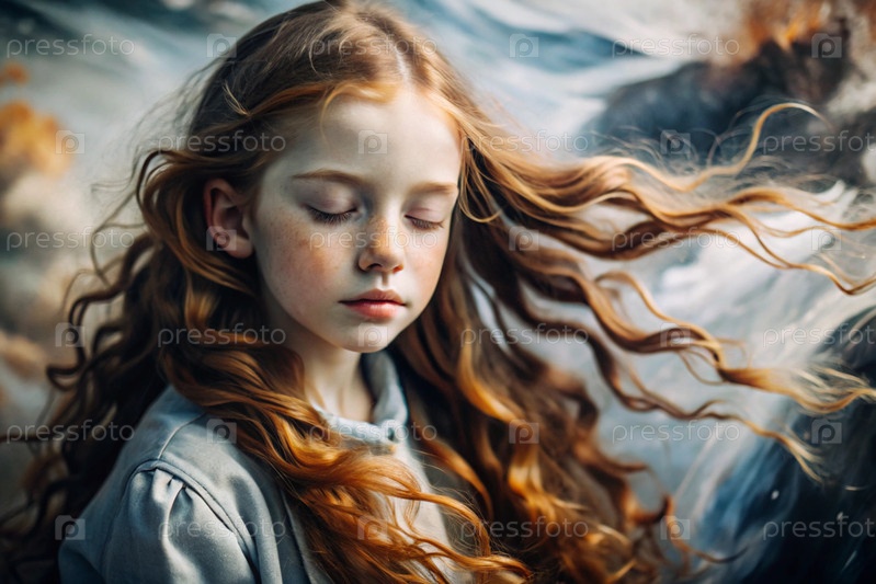 Портрет красивой маленькой рыжеволосой девочки с длинными волнистыми волосами и задумчивым взглядом.Власы развиваются и создают ощущение легкости и естественности