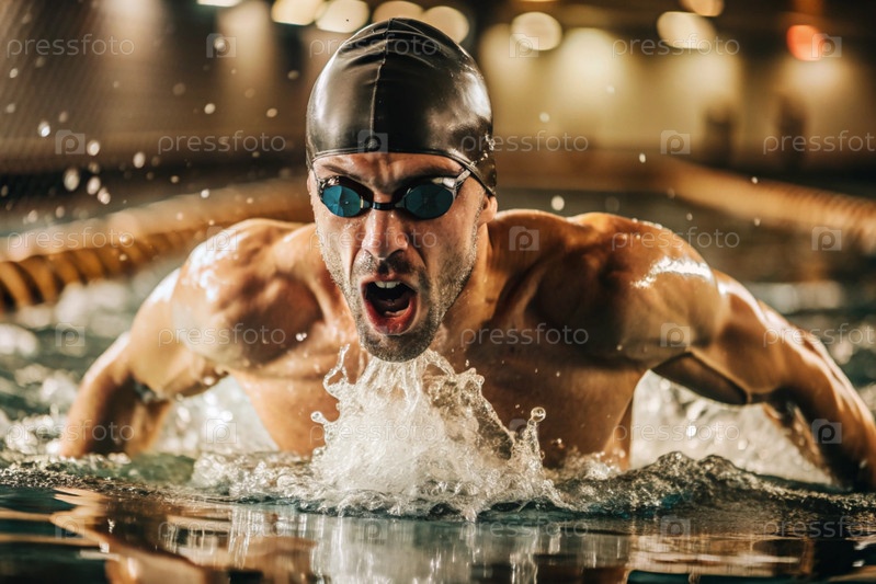 Спортивное плавание. Мужчины-плаватели. Спортсмен с очками в бассейне во время соревнований на близком расстоянии. Человек смотрит на камеру