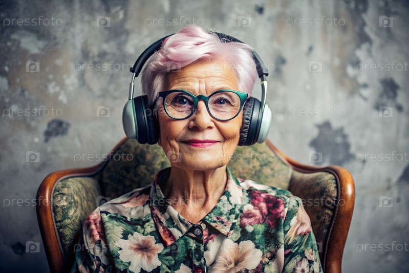 Стильная, современная, счастливая 60-70-летняя женщина слушает музыку в больших беспроводных наушниках дома, на стуле в гостиной