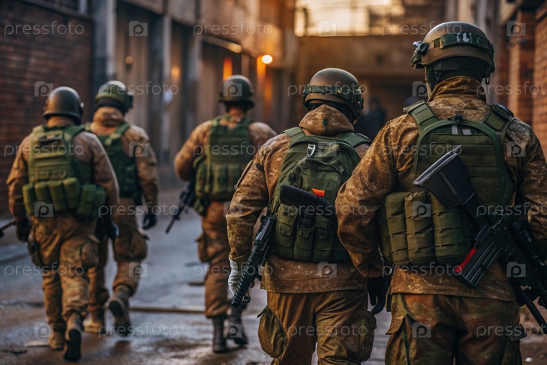 Военные действия.Солдаты элитного антитеррористического подразделения армии находятся среди разрушенных зданий.Очистите территорию врага