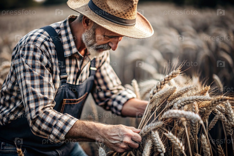 Фермер-мужчина держит золотые колосья пшеницы на фоне созревающего поля. Близкий план фермера. Концепция посадки и сбора богатого урожая. Сельский пейзаж при закате солнца