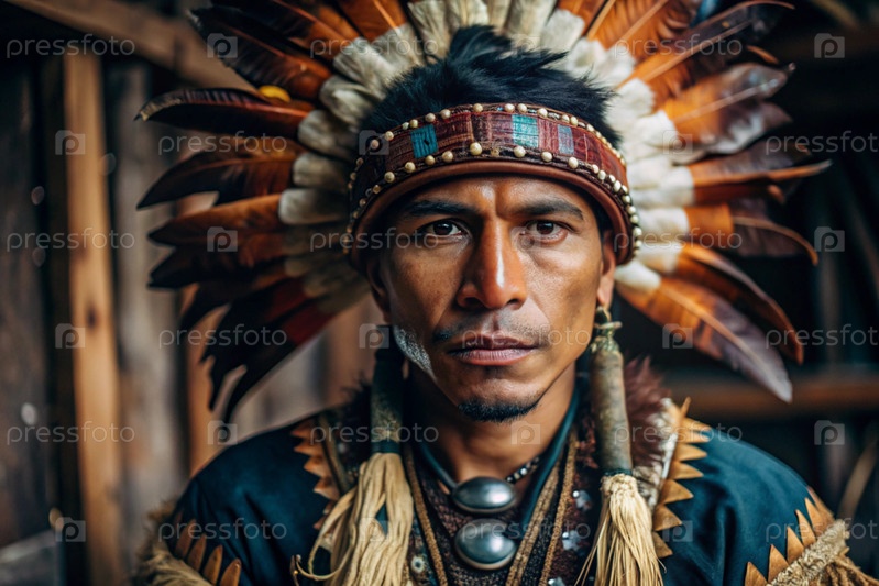 Красивый мужской портрет индейца, вождя племени в пернатом головном уборе