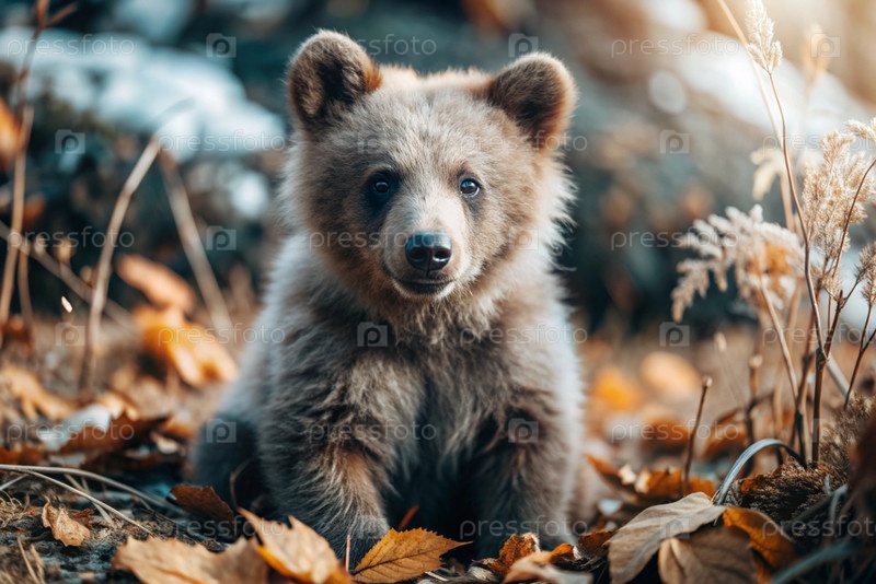Милый медвежончик, сидящий среди осеннего желтого листья.Охота на животных.Краснобойство