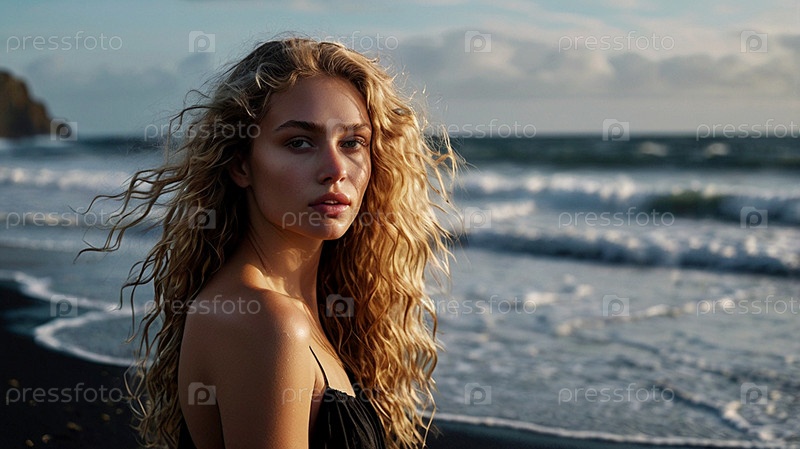 Портрет красивой женщины на пляже с черным песком против моря.Романтическая, спокойная и чувственная фотография девушки в нежном чёрном платье