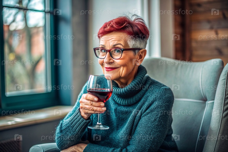 Современная, стильная пожилая женщина с бургундскими волосами со стаканом красного вина на стуле в гостиной дома