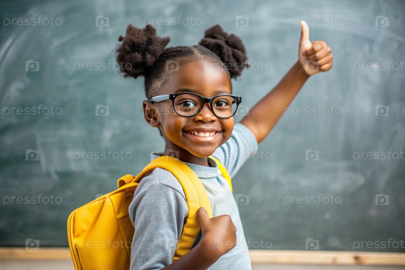 Милая чернокожая афроамериканка с очками показывает класс рукой. Ребенок впервые идет в школу. Ребёнок со школьной сумкой и книгой. Ребёнок в классе с доской. Возвращение к школе