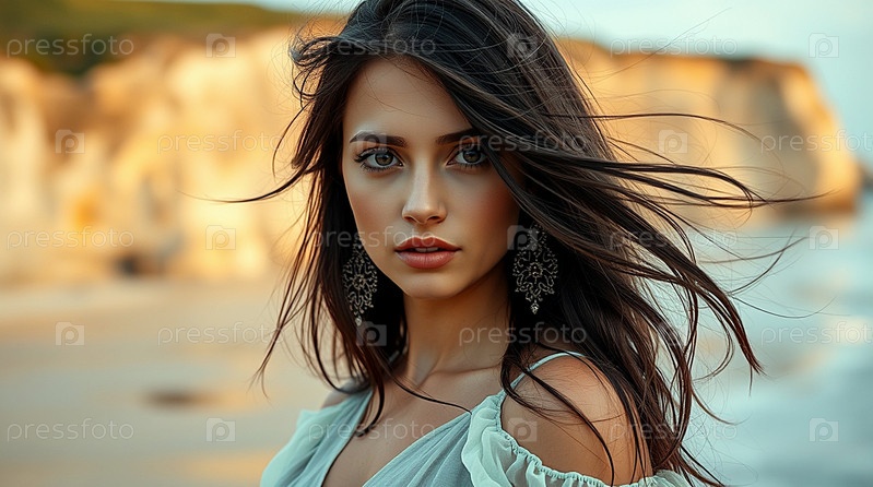 Портрет красивой женщины на пляже перед морем.Романтическая, спокойная и чувственная фотография девушки в проветренном нежном платье