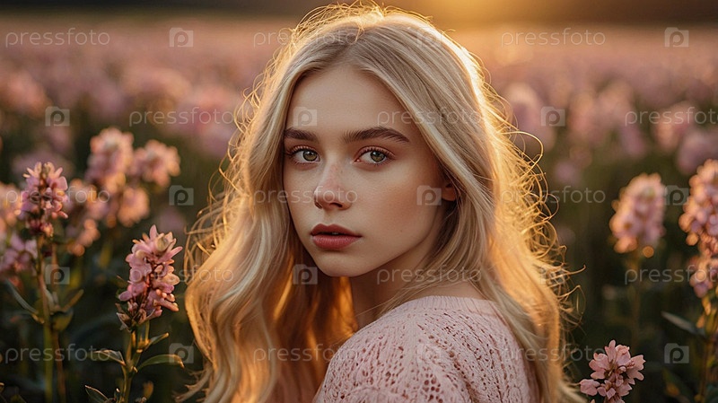 Теплый портрет красивой кудрявой женщины на цветущем поле при закате солнца. Романтическая, спокойная и чувственная фотография девушки в деликатном платье