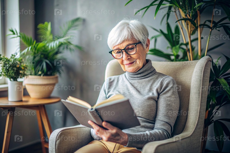 Пожилая пенсионерка, современная бабушка в очках, читает книгу во внутренней части гостиной, сидя на стуле дома при естественном свете