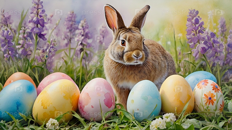 Концепция яркого пасхального праздника: нежные пасхальные яйца и пасхальный кролик