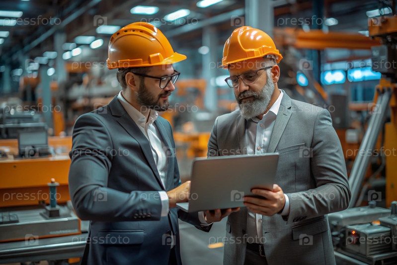 Профессиональный инженер, рабочий и техник в жестких шляпах используют клипборд для обсуждения работы на сталелитейном заводе