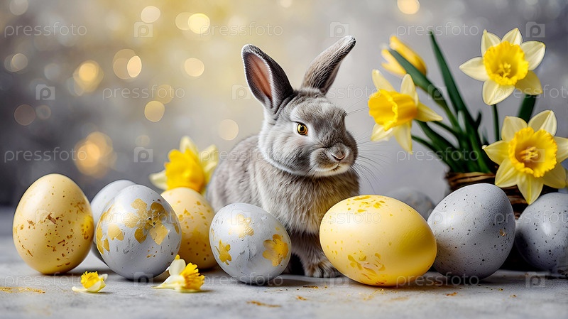 Нежные пасхальные яйца, серый кролик и цветы нарцисс на фоне пастельной акварели с нежными венами