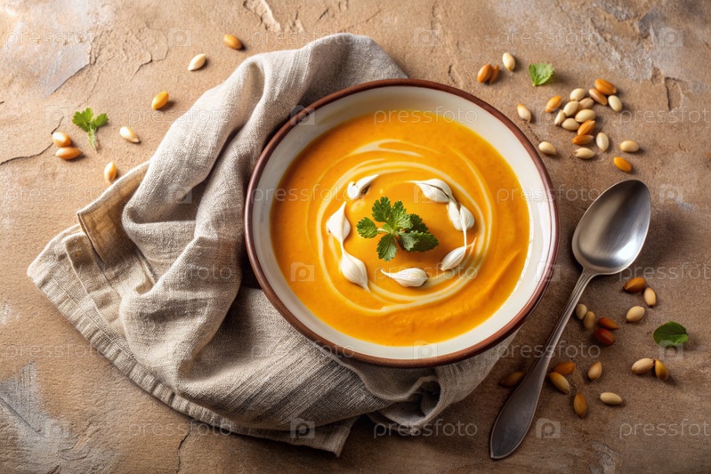 Традиционный мягкий тыквенно-кремовый суп с сливками и семьями тыквы на бежевом бетонном фоне