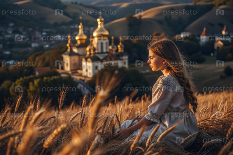 Молодая девушка в льняном платье на фоне поля спелых золотых пшениц и православной церкви при закате солнца