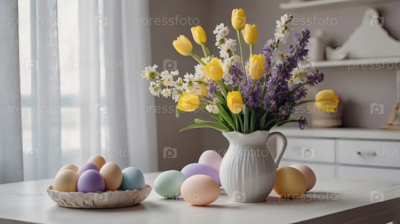 Концепция яркого пасхального праздника. Ретро интерьер дома с пасхальным декором. Весенние цветы в белой вазе и пасхальные яйца в пастельных оттенках