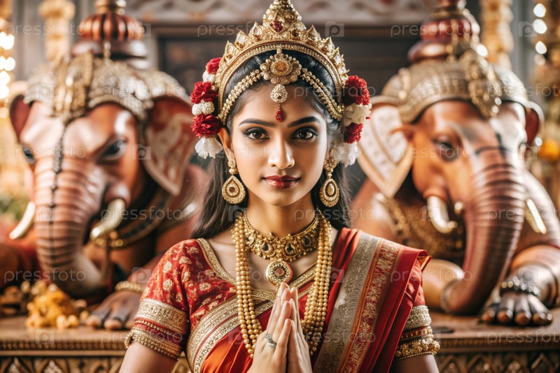 Красивая индийская девушка в традиционном национальном костюме, сари. со слонами. портрет символизирует традиции, культуру и красоту народа Индии