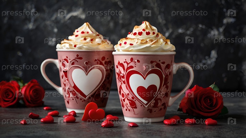 Концепция Дня святого Валентина для кафе и ресторанов красные чашки кофе латте с сердцами вокруг горячие напитки для влюбленных