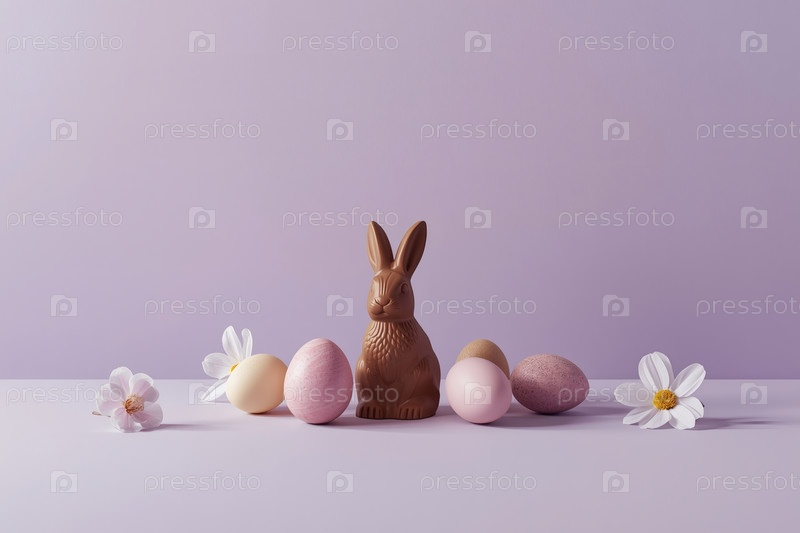 Счастливая Пасха 2026, минималистическое студийное фото. Шоколадный пасхальный кролик, пасхальные яйца и нежные весенние цветы. Мягкое освещение студии создает ощущение чистоты и воздушности