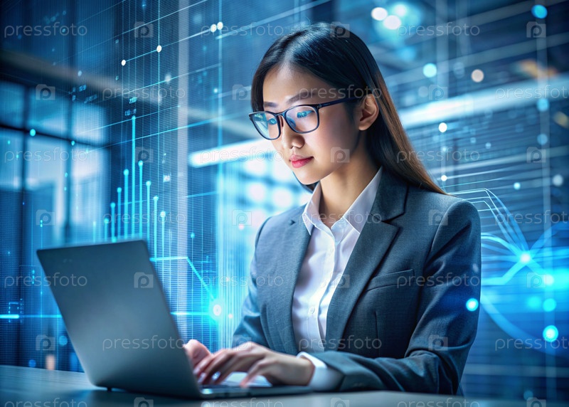 Красивая молодая азиатская девушка в костюме работает на ноутбуке в офисе с цифровыми кодами на виртуальном экране Цифровые технологии будущего Разработка программного обеспечения