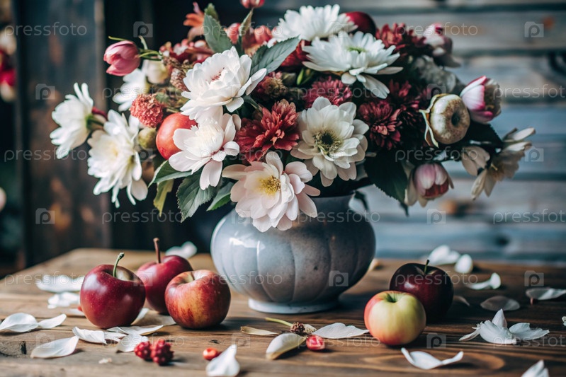 Красочное лето, осенний букет цветов различных красных, розовых, белых оттенков в вазе и спелые красные яблоки на столе
