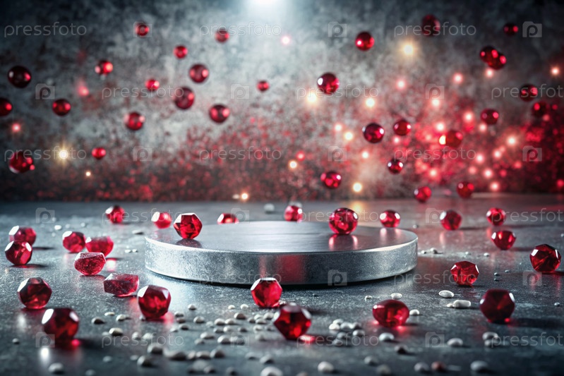 Минималистский фон для выставки ювелирных изделий. Современный пустой подиум с серой стеной и рубинами. Креативный дизайн презентации продукта