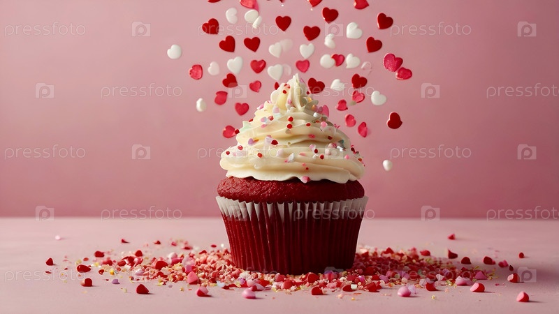 Проветриваемый красный бархатный кексы с сливочным сыром и сердцами, окруженными сахарной ленточкой на тёплом розовом фоне ко Дню святого Валентина и 8 марта