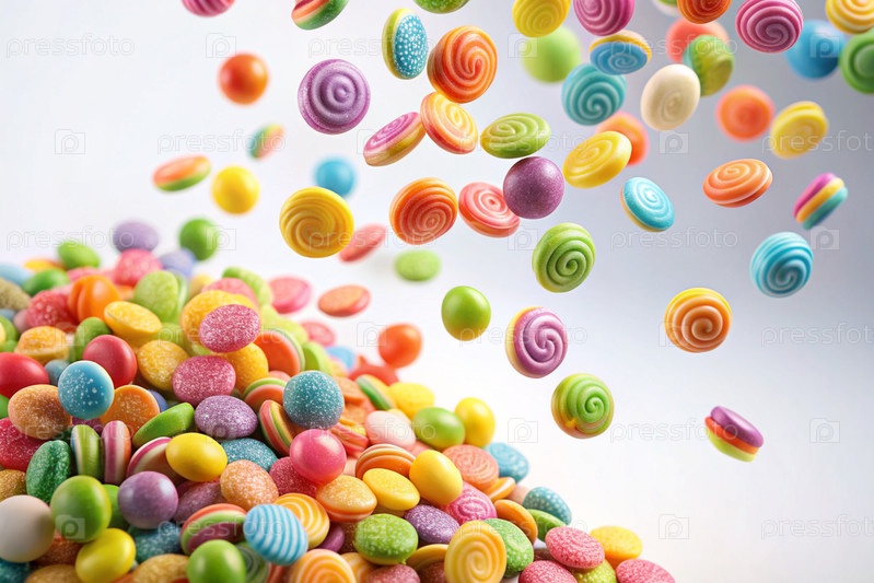 Цветные конфеты в ассортименте на белом фоне. Различные сладости, кондитерские изделия и драже различных форм и цветов. Яркие тени радуги