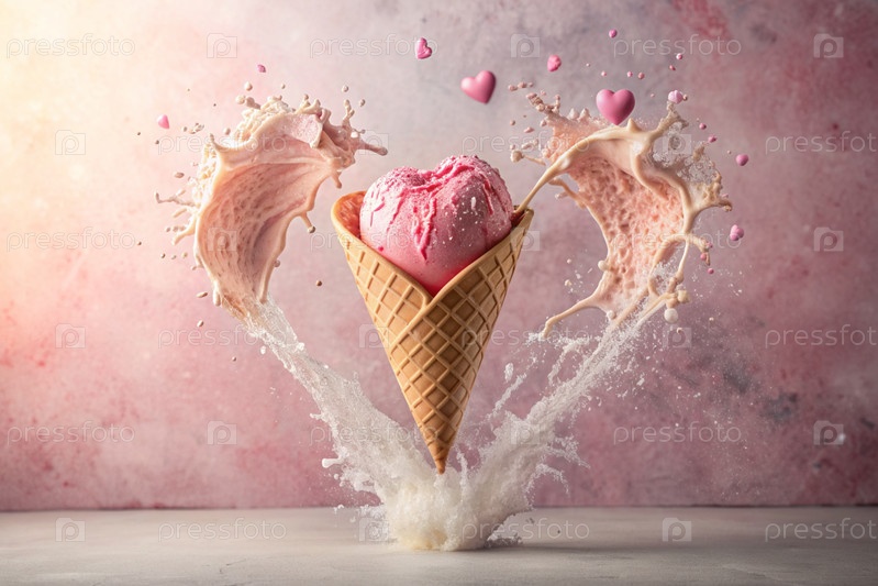 Сладкий десерт. Любовь к мороженому. Сердечно-образный конус мороженого с брызгами, сердцами и пятнами. Концепция Дня святого Валентина. Баннер, реклама