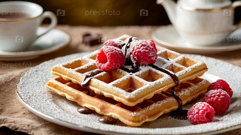 Свежевыпеченные бельгийские вафли украшены сахарным порошком, шоколадом и свежими ягодами