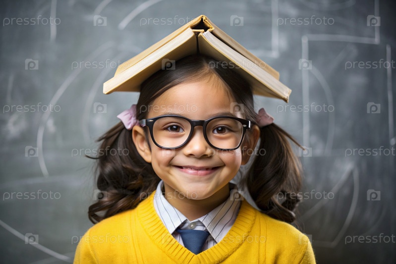 Красивая девушка с очками и книгами на голове. Ребенок впервые идет в школу. Ребёнок в классе со доской на заднем плане. Возвращение к школе