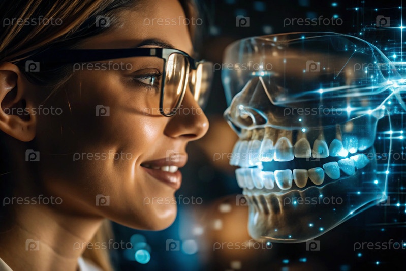 Новые технологии цифрового искусственного интеллекта в зубных протезах. Имплантаты. Женщина-стоматолог с идеальной улыбкой и цифровая графика на виртуальном экране. Концепция стоматологического здоровья и ухода за зубами