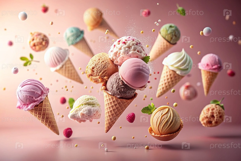 сладкий, холодный десерт. сливочное ванильное мороженое с различными вкусами в конусах пластинок. баннер, реклама. Всемирный день мороженого. сладкий десерт