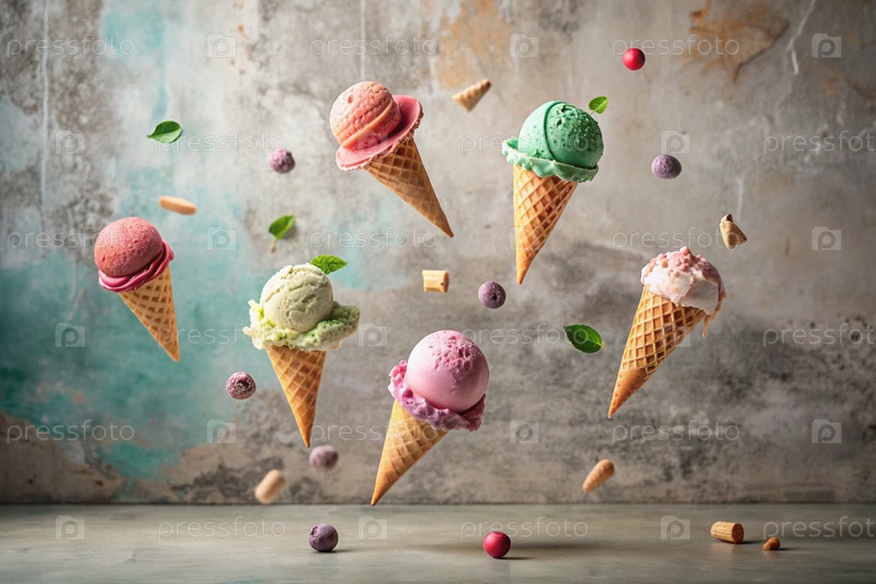 сладкий, холодный десерт. сливочное ванильное мороженое с различными вкусами в конусах пластинок. баннер, реклама. Всемирный день мороженого. сладкий десерт