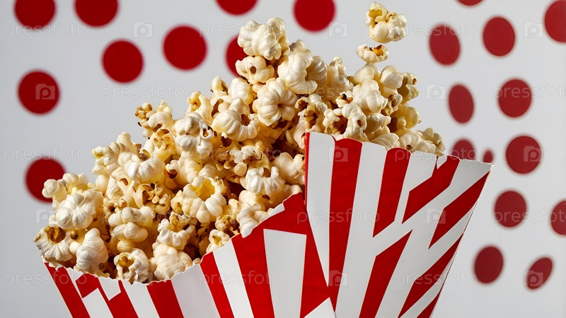 Красно-белый полосатый ящик с солеными попкорнами.Популярная закуска в кино