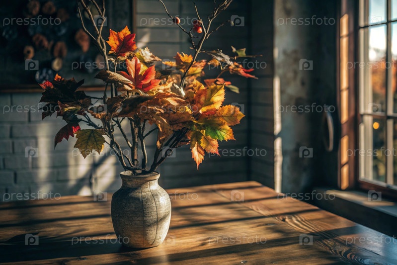 Ветви с золотыми осенними листьями в керамической вазе на деревянном столе у окна. Концепция домашнего комфорта. Осенний декор для Хэллоуина