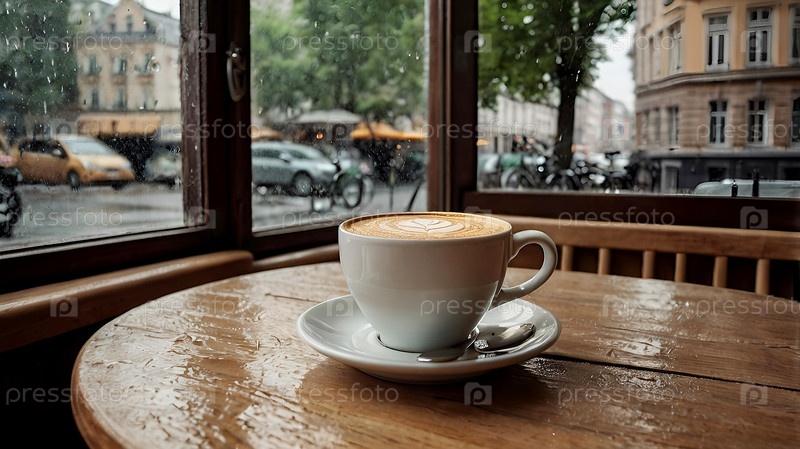 Белая чашка горячего кофе на столе в современном уютном кафе у окна. снаружи идет дождь. понятие комфорта и тепла